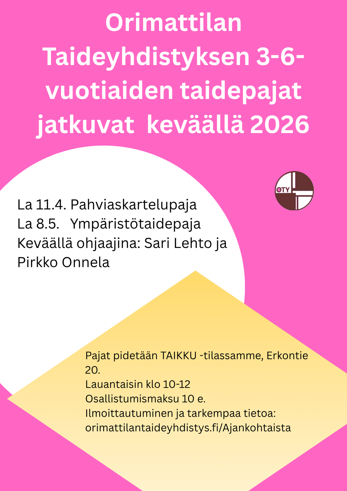 Pajat toteutetaan pääosin TAIKUlla ( Erkontie 20). Poikkeuksena Ympäristötaidepaja, joka pidetään kotiseutumuseolla, jos sää sallii.
