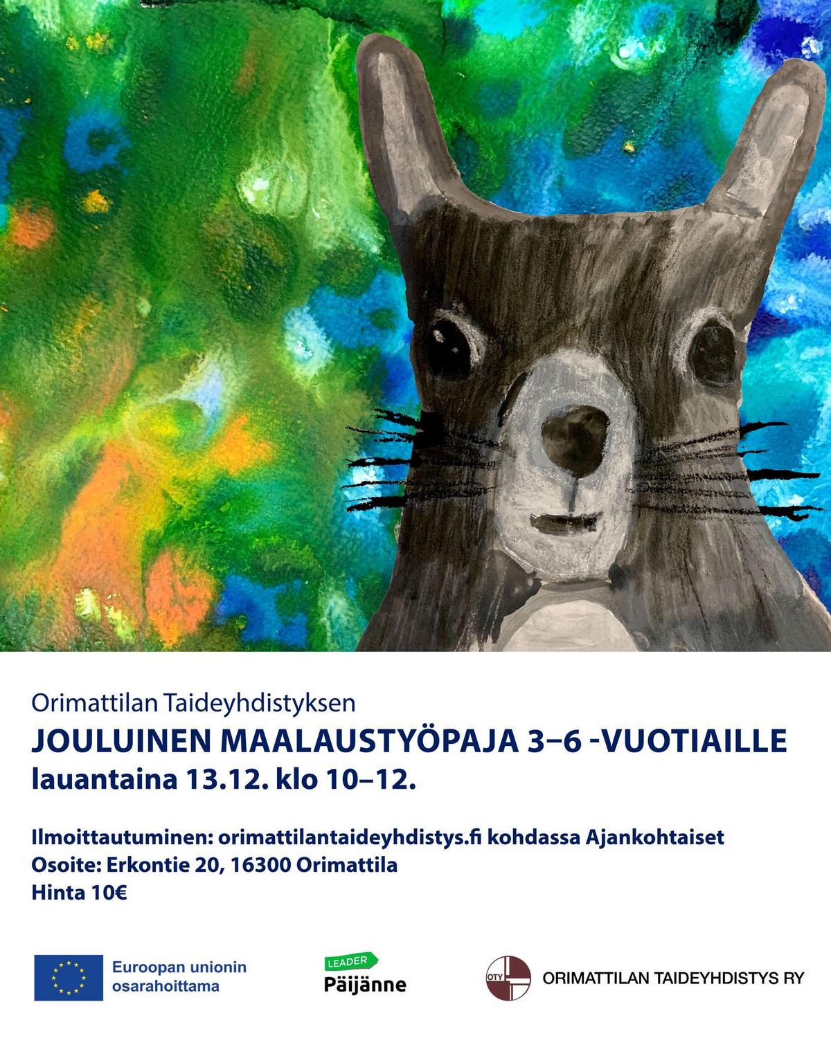 Allaolevalla lomakkeella voit ilmoittautua Orimattilan Taideyhdistyksen 3-6 -vuotiaitten lasten taidepajaan, joka järjestetään lauantaina 13.12. klo 10-12 Taideyhdistyksen tilassa Taikussa. Osoite on Erkontie 20, Orimattila.