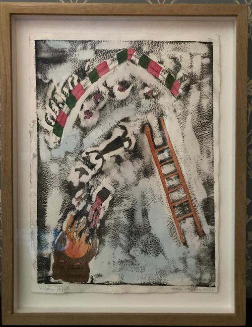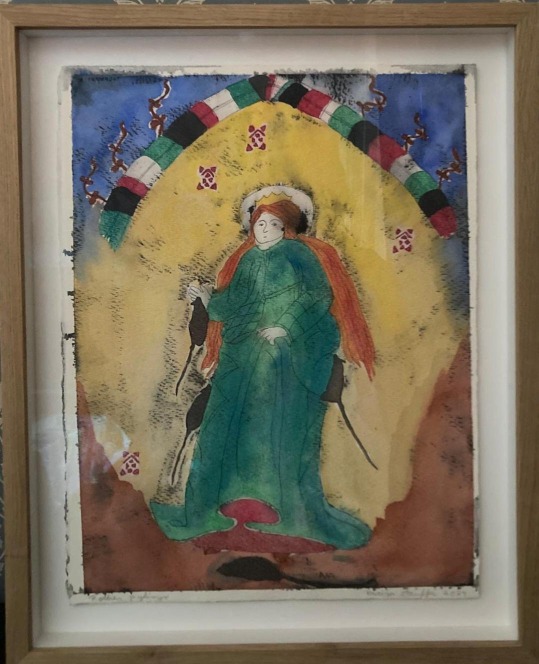 Vuonna 2023 luin Anneli Kannon kirjan Rottien pyhimys joka kertoo fiktiivisen tarinan Hattulan Pyhän Ristin kirkon maalareista. Kävin myös katsomassa kirjasta sovitetun näytelmän Hämeenlinnan kaupunginteatterissa. Nämä tapahtumat yhdistettyinä siihen , että Hattulan Pyhän Ristin kirkko on lapsuuteni ja nuoruuteni kotikirkko, herättivät kirkon seinämaalaukset eloon mielessäni. Prosessista on syntynyt tähän mennessä yhdeksän tussipesutekniikalla tehtyä teosta joista kuusi on nyt esillä Orimattilan kirjastossa joulukuun ajan.”